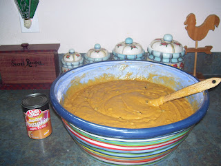 Martha Stewart won't be calling me for photo or cooking lessons, but the bread tastes good and freezes well. And, I have discovered that I can quadruple the recipe in this bowl - which saves time because we can make lots of loaves for Christmas gifts. My mom's recipe did not call for chocolate chips, but I don't know anybody who doesn't love chocolate and it tastes wonderful melted in warm pumpkin bread. Wrap the loafs in foil and tie a festive ribbon around them. I have never had anyone turn away my children when they offer a loaf of this bread. Teachers love pumpkin bread too, especially with lots of chocolate chips. Something from the kitchen spells t-i-m-e = l-o-v-e.
